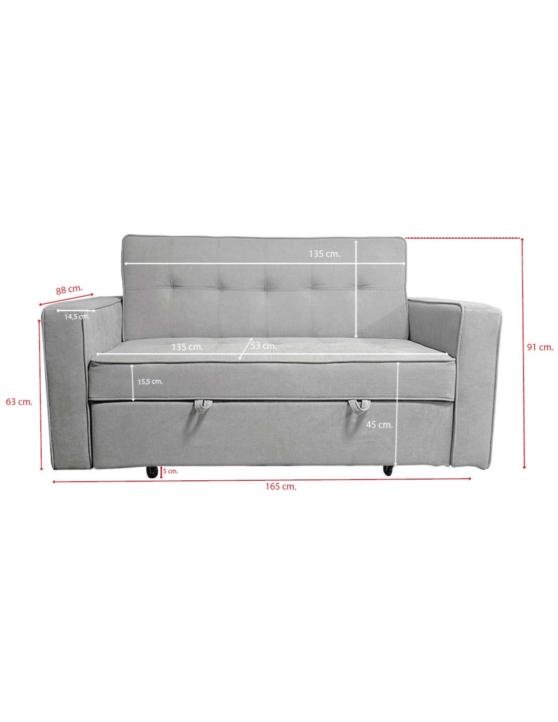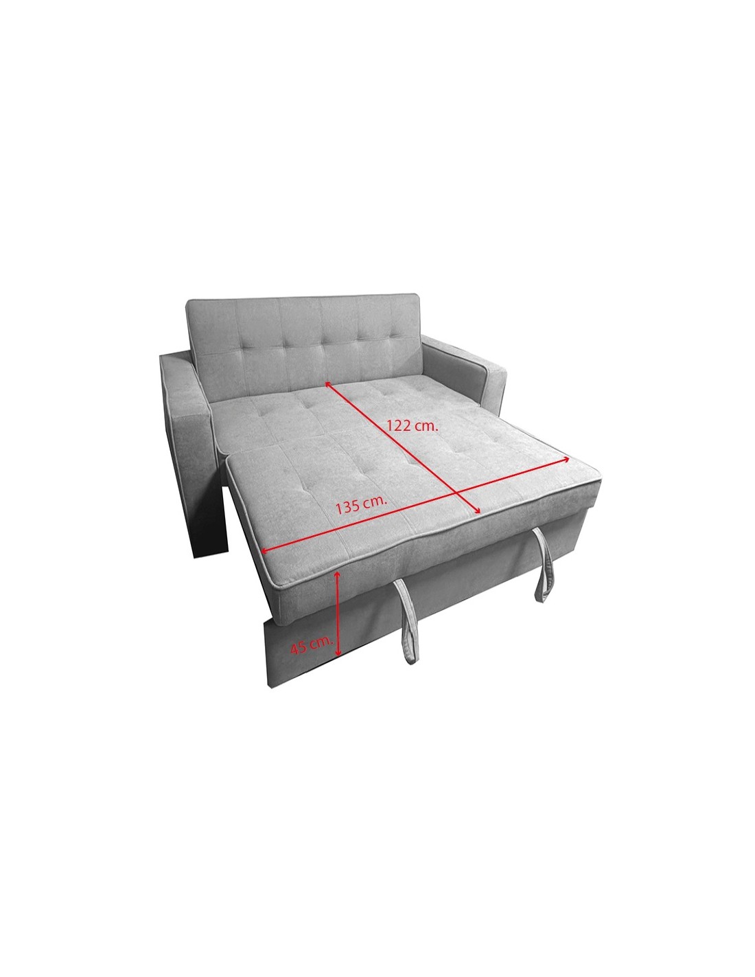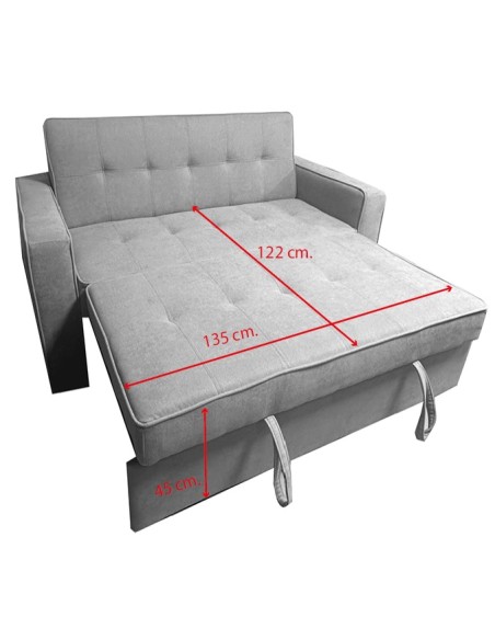 CARACTERÍSTICAS: Sofá convertible en cama. Dispone de estructura de madera. Los asientos son de espuma. Posee un mecanismo para la apertura de la cama inferior. Incluye dos cojines decorativos