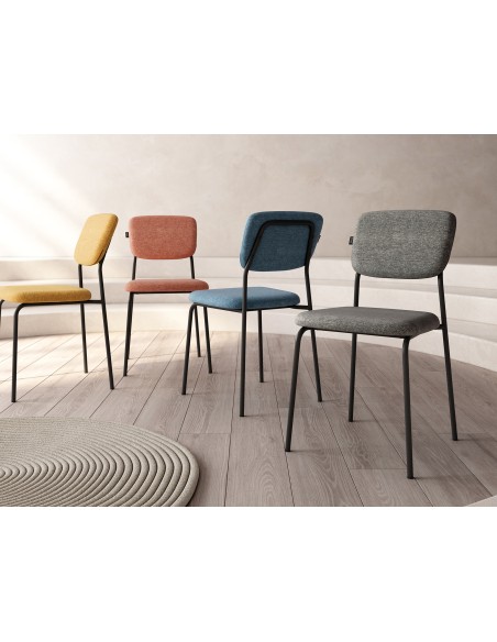 La silla CAIRO tiene un estilo de Inspiración retro con un aire moderno, perfecta para ambientes actuales que combinan estética y funcionalidad. La estructura dispone de patas metálicas finas en acabado negro mate, que aporta estabilidad con una presencia ligera y elegante. EL asiento y el respaldo, son acolchados y tapizados en tejido suave. El diseño recto con esquinas redondeadas ofrece una comodidad sencilla y una imagen muy versátil. El diseño del respaldo está levemente reclinado para mayor confort, con una estructura trasera metálica visible que acentúa el carácter urbano e industrial de la silla. Los detalles en los acabados son pulidos, costuras discretas y una pequeña etiqueta textil que refuerza el enfoque en el diseño de calidad.