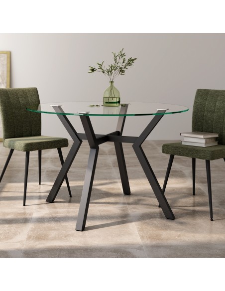 La mesa de comedor Alborán combina estética moderna y elegancia atemporal gracias a su cuidada selección de materiales. Su estructura metálica negra le confiere una base sólida y estable, con líneas rectas y limpias que aportan un toque industrial. El sobre de cristal templado de 12 mm añade un efecto de ligereza visual, dejando pasar la luz y haciendo que el espacio se sienta más amplio y luminoso.