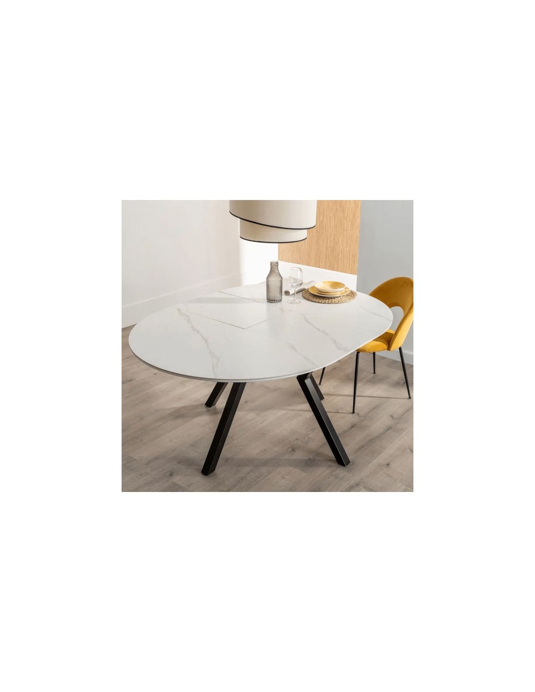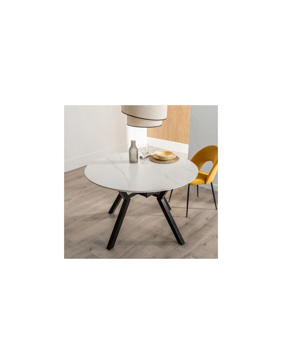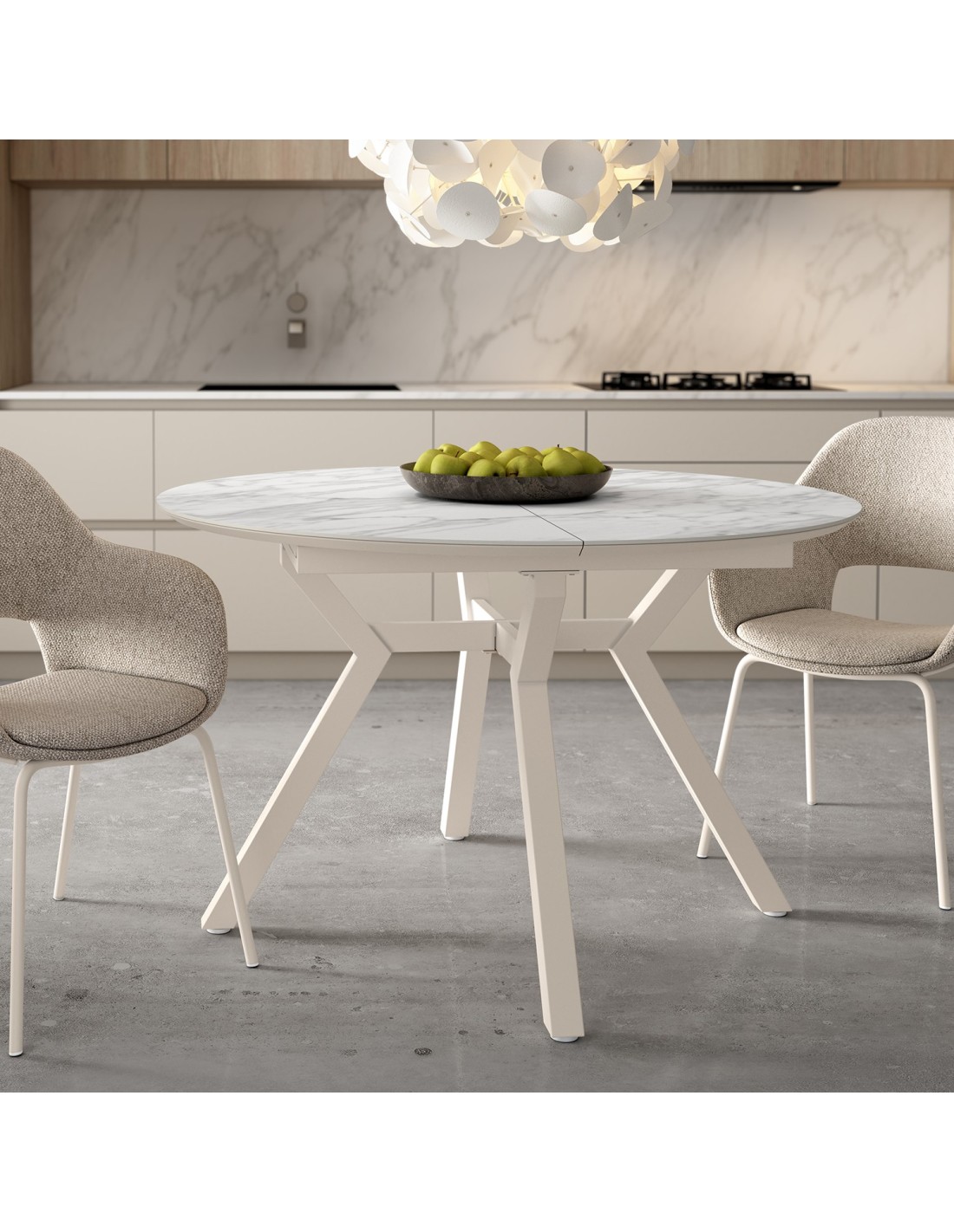 Elegancia y funcionalidad se unen en la mesa de comedor extensible Ross. Su diseño redondo y estructura de metal lacado en color marfil aportan un estilo moderno y luminoso, ideal para todo tipo de comedores. El sobre combina MDF biselado con una capa superior de porcelánico de 6 mm con acabado efecto piedra, lo que garantiza resistencia al calor, a los golpes y fácil limpieza. Gracias a su sistema de apertura extensible, esta mesa permite ampliar su capacidad de forma sencilla, adaptándose a reuniones familiares o con amigos sin perder estética ni estabilidad. Una opción perfecta para quienes buscan una mesa versátil, resistente y de diseño contemporáneo.