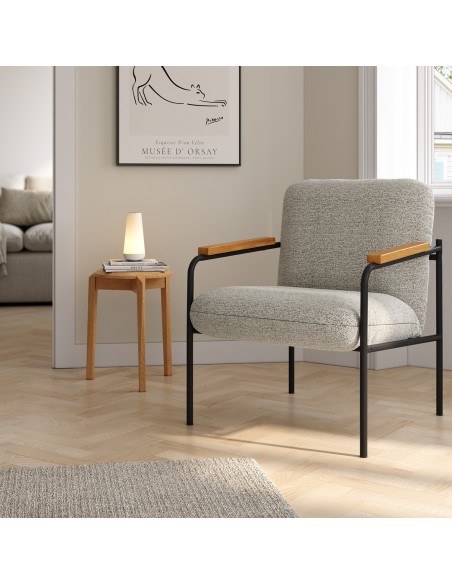 La butaca ALOE dispone de un equilibrio perfecto entre diseño industrial y calidez natural, esta butaca tapizada ofrece una estética contemporánea ideal para cualquier estancia. Su estructura metálica negra le otorga firmeza y estilo, mientras que los reposabrazos de madera aportan un toque orgánico y confortable al conjunto. El asiento y respaldo están totalmente tapizados, brindando una experiencia de confort suave y envolvente, ideal para momentos de relax o lectura. Su diseño versátil permite integrarla fácilmente tanto en hogares modernos como en espacios profesionales con carácter. Una pieza que combina funcionalidad, confort y un diseño visualmente atractivo.
