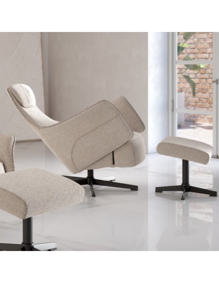La Butaca Relax Kiara te permitirá disfruta de momentos de auténtico descanso con esta butaca giratoria 360º, diseñada para combinar funcionalidad y estilo contemporáneo. Su tapizado suave y acolchado proporciona una comodidad excepcional, ideal para largas sesiones de lectura, series o relax. Incluye relax manual, lo que permite ajustar el respaldo con facilidad y adaptarlo a la postura deseada. La pata metálica negra aporta estabilidad y un toque moderno al diseño, mientras que el reposa pies a juego completa la experiencia al ofrecer soporte extra para las piernas. Su diseño ergonómico envuelve el cuerpo con firmeza y suavidad, y su estética encaja a la perfección en interiores actuales. Una elección ideal para quienes buscan bienestar sin renunciar al diseño.