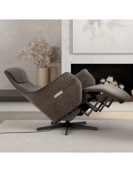 Redefine tus momentos de descanso con la Butaca Relax Karen. Esta sofisticada butaca giratoria 360º tapizada, que une tecnología y diseño en una sola pieza. Gracias a su relax eléctrico, podrás ajustar la inclinación fácilmente con solo pulsar un botón, alcanzando la posición Zero Gravity, pensada para mejorar la circulación y aliviar la presión corporal. Su tapizado envolvente brinda una experiencia cómoda y ergonómica, ideal para el relax diario. La pata metálica negra le da estabilidad y un aire moderno, mientras que el puerto de carga USB integrado permite mantener tus dispositivos siempre conectados sin moverte del asiento. Perfecta para salones contemporáneos, despachos o rincones de lectura.