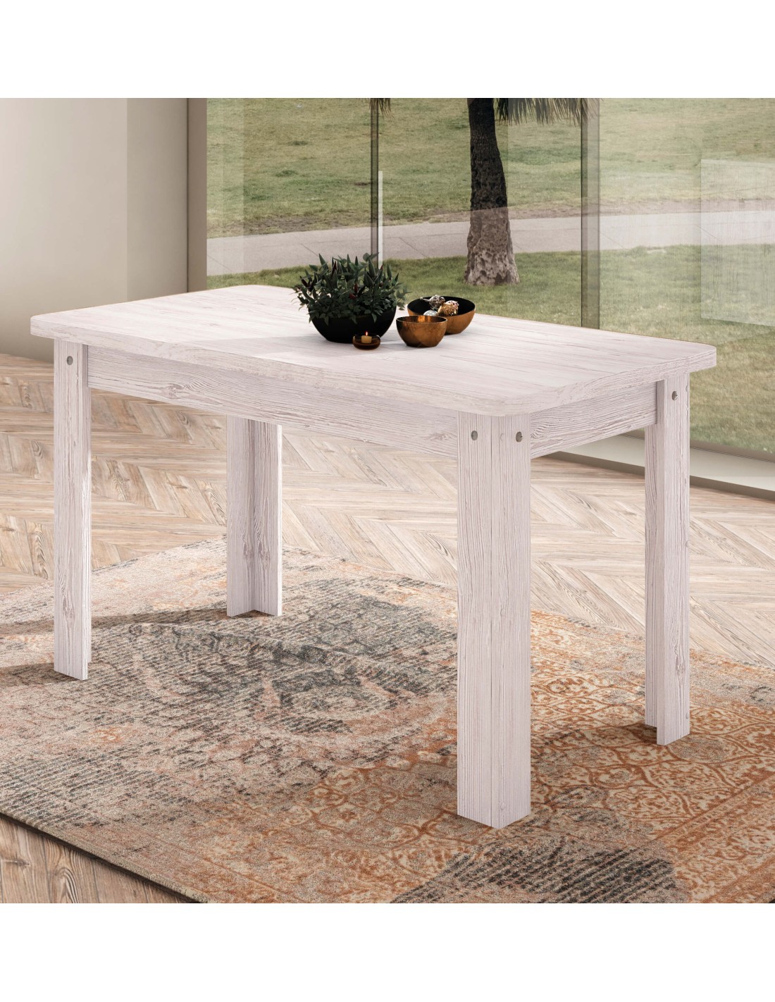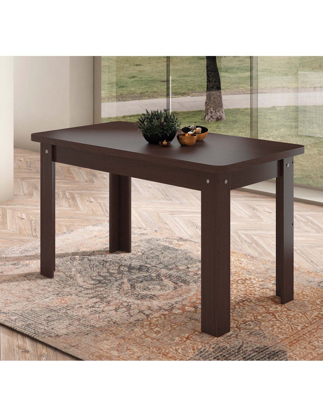 Mesa comedor fija con precio muy económico, disponible en dos medidas, 120 y 140cm. Está fabricado con tablero de aglomerado con chapa sintetica y melaminizada (16 y 32mm) y herrajes metálicos.