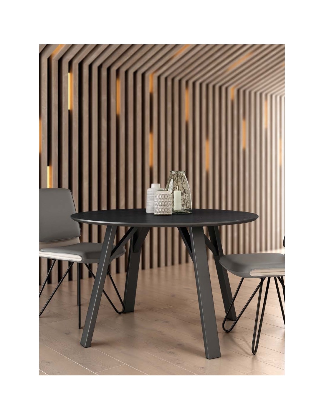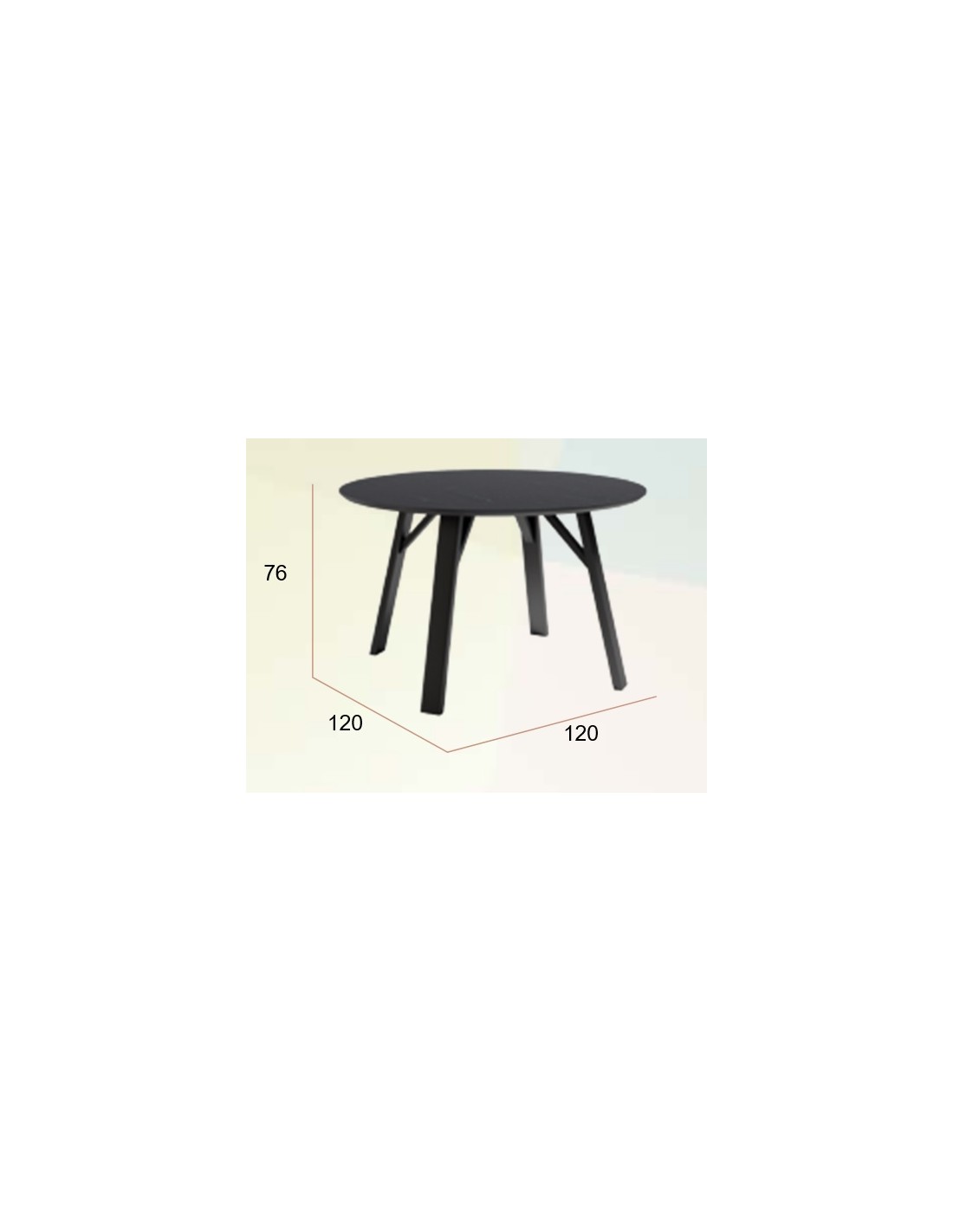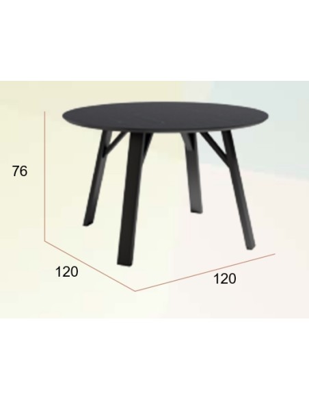 Mesa de comedor fija. Patas metálicas negras y sobre biselado de Ø120 cm y 22 mm de espesor en 3 acabados diseño piedra.