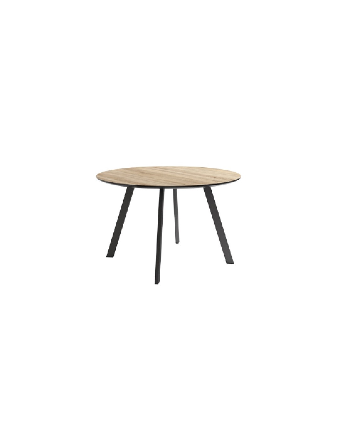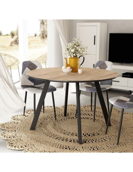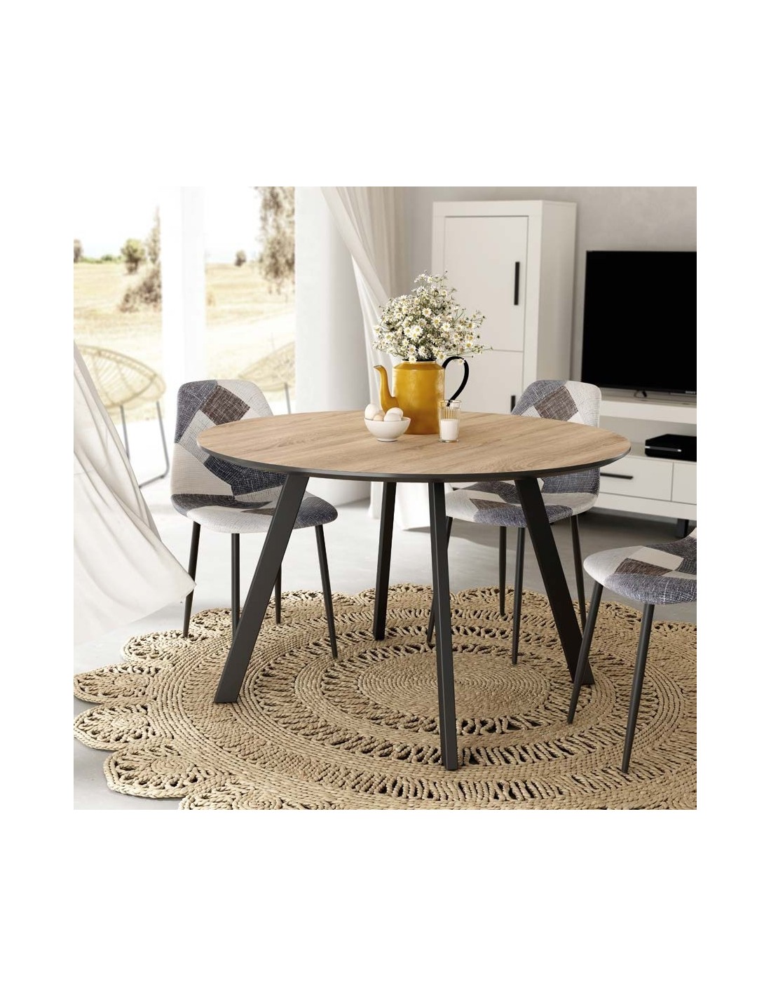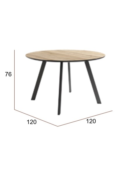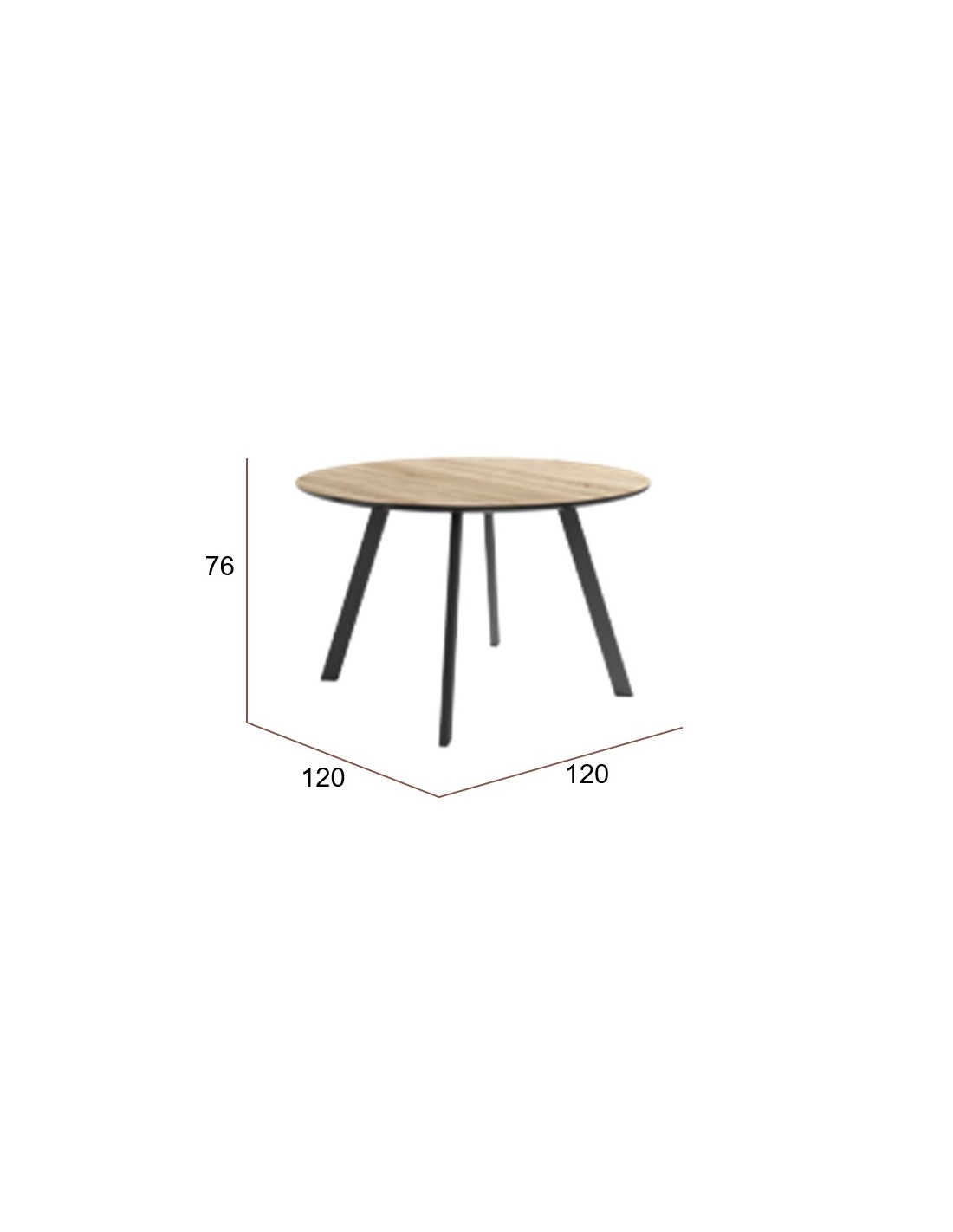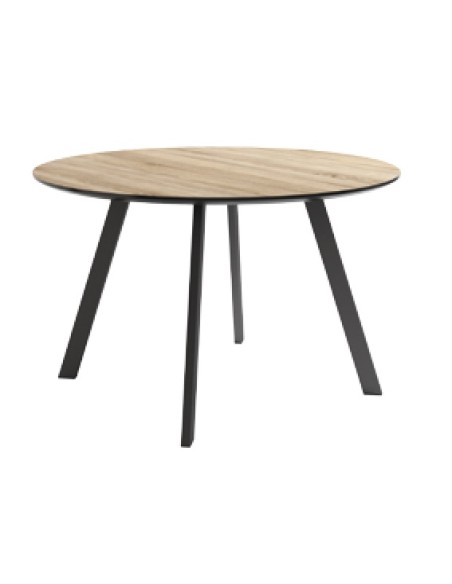 Mesa de comedor fija. Patas metálicas negras y sobre biselado de Ø120 cm y 25 mm de espesor en 5 acabados diseño madera, y 3 acabados diseño piedra.