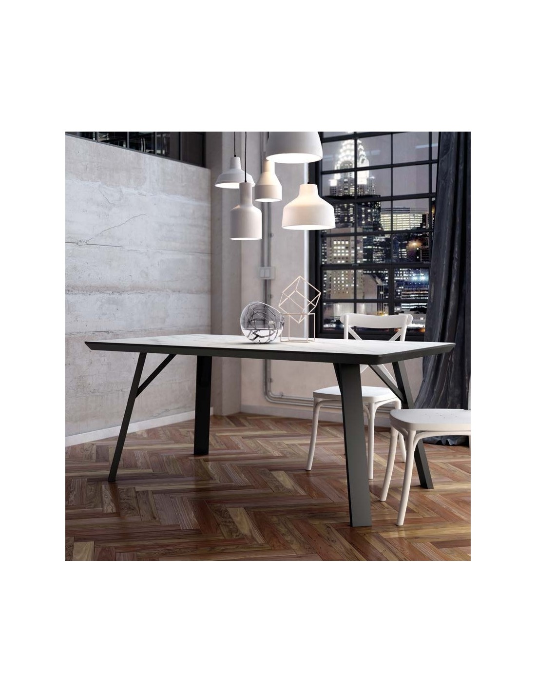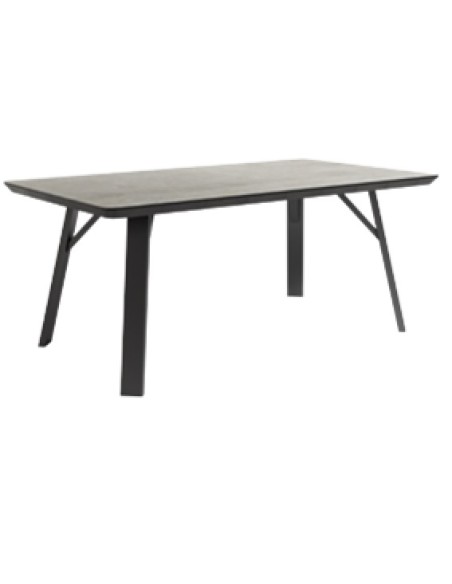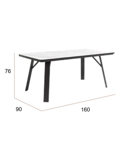Mesa de comedor fija. Patas metálicas negras y sobre biselado de 48 mm de espesor en 3 acabados diseño piedra. Disponible en dos medidas: 90x160cm y 100x180cm.