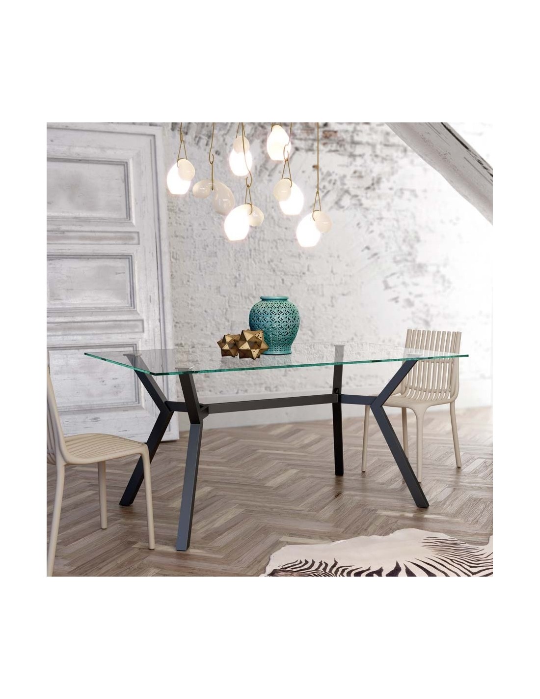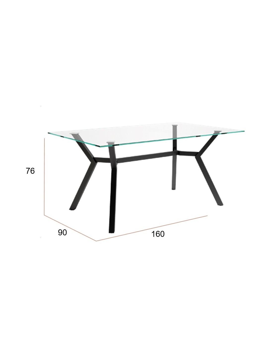 Mesa de comedor fija. Patas metálicas negras y sobre de cristal de 12 mm. Disponible en dos medidas: 90x160cm y 100x180cm.