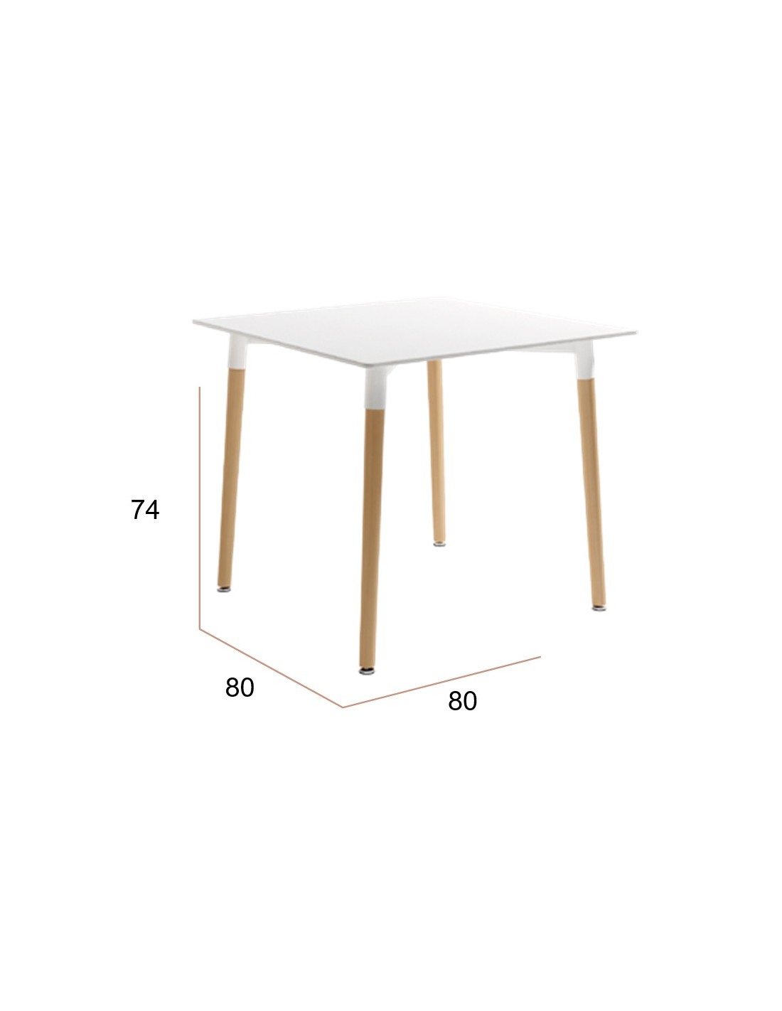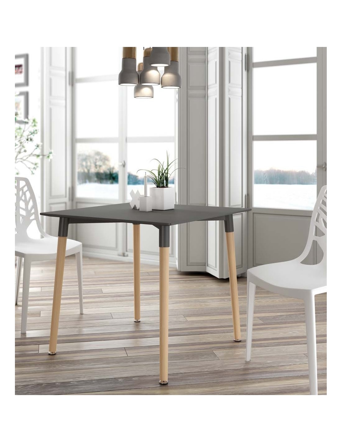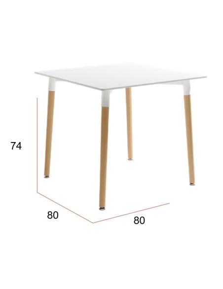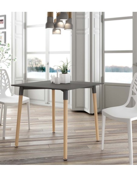 Mesa de comedor fija cuadrada. Patas de madera con regulación en la base y sobre de MDF lacado de 80 x 80 cm. Disponible en blanco y grafito.