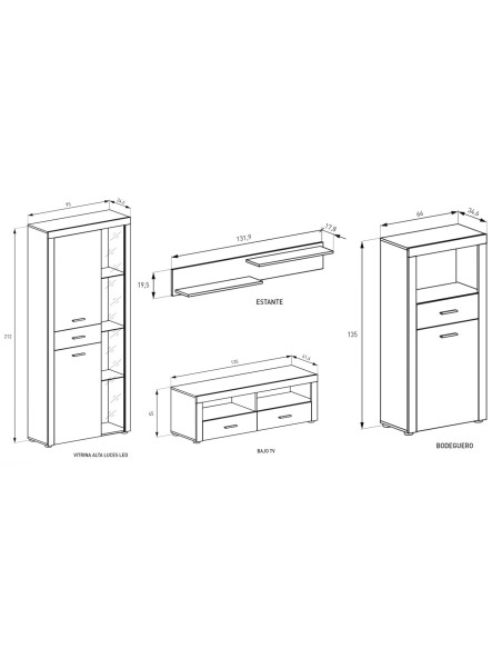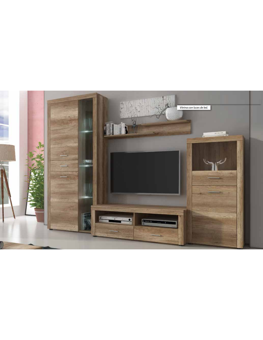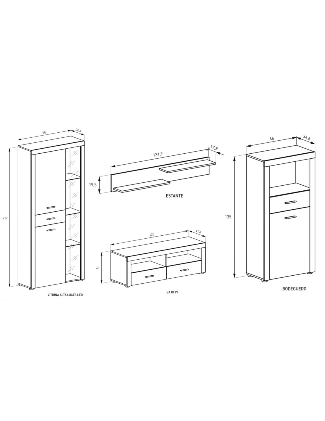 Composición Texas de 2.96 cm, en color Cañón. Está formada por bajo tv de 2 cajones y 2 huecos, vitrina vertical alta de cristal con LUCES LED, bodeguero con cajón y estante de pared. MUEBLE KIT.