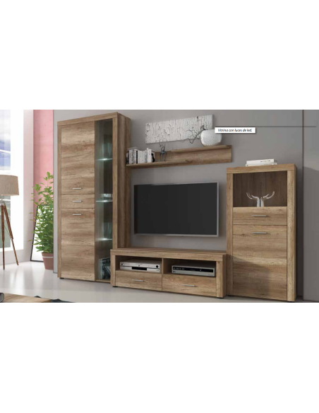 La composición Texas de 296cm, está formada por bajo de TV con dos huecos y dos cajones, un mueble bodeguero, vitrina alta con puertas combinadas en melamina y cristal, y un estante doble con trasera. Tiene una buena relación calidad precio. Fabricado en tablero melamínico de alta calidad, con Herrajes metálicos.