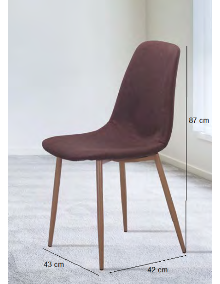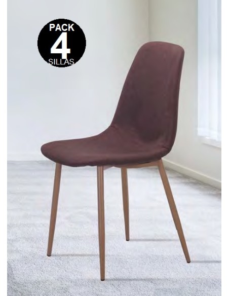 Silla práctica y económica tapizada en tela chocolate y con las patas metálicas pintadas en color madera. Se vende en juegos de 4.